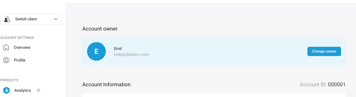 You can change the owner by opening the account management page: https://account.databox.com/company-information.