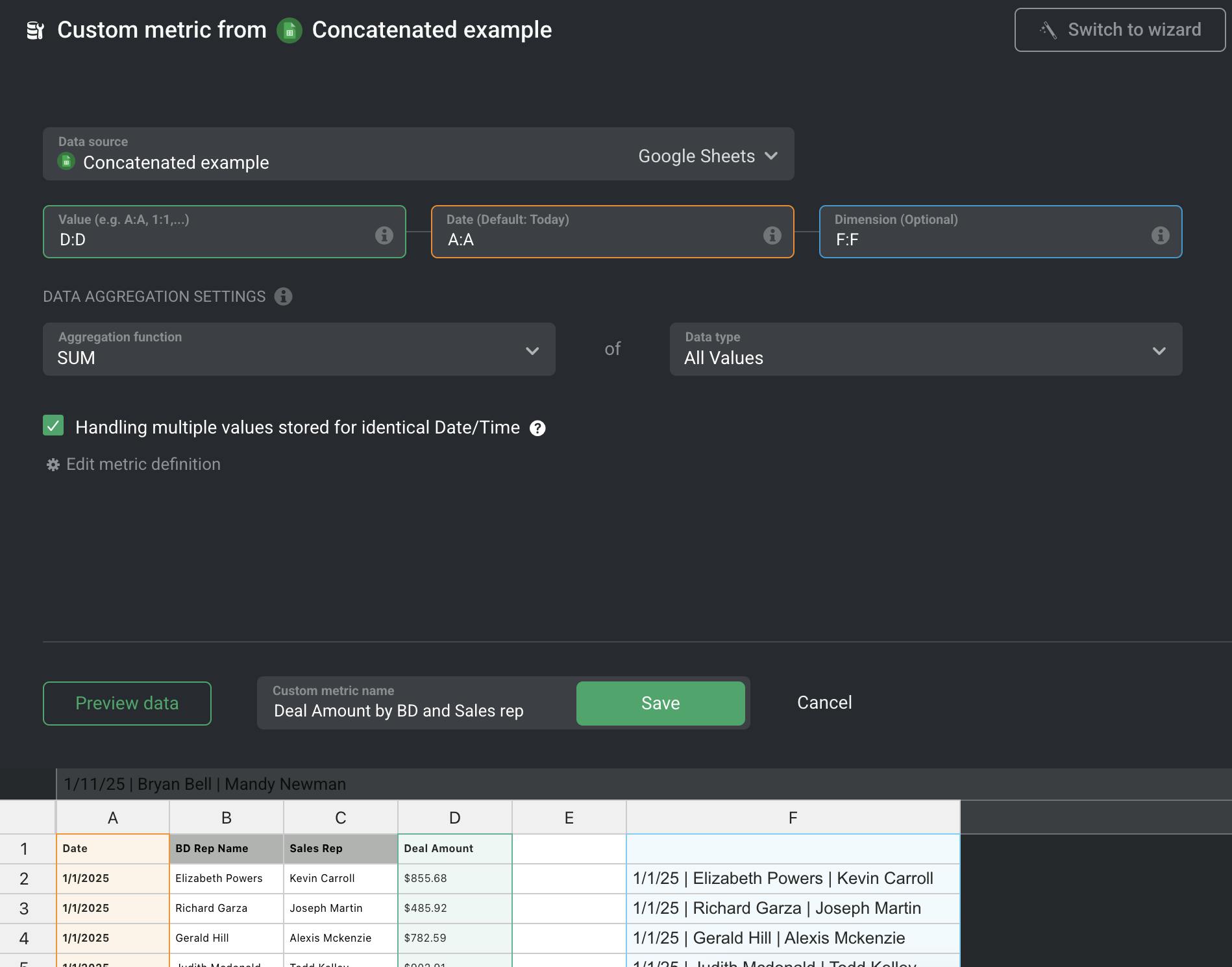 Navigate to Metric Builder and select the correct columns to visualize the new concatenated column you created in the previous step: