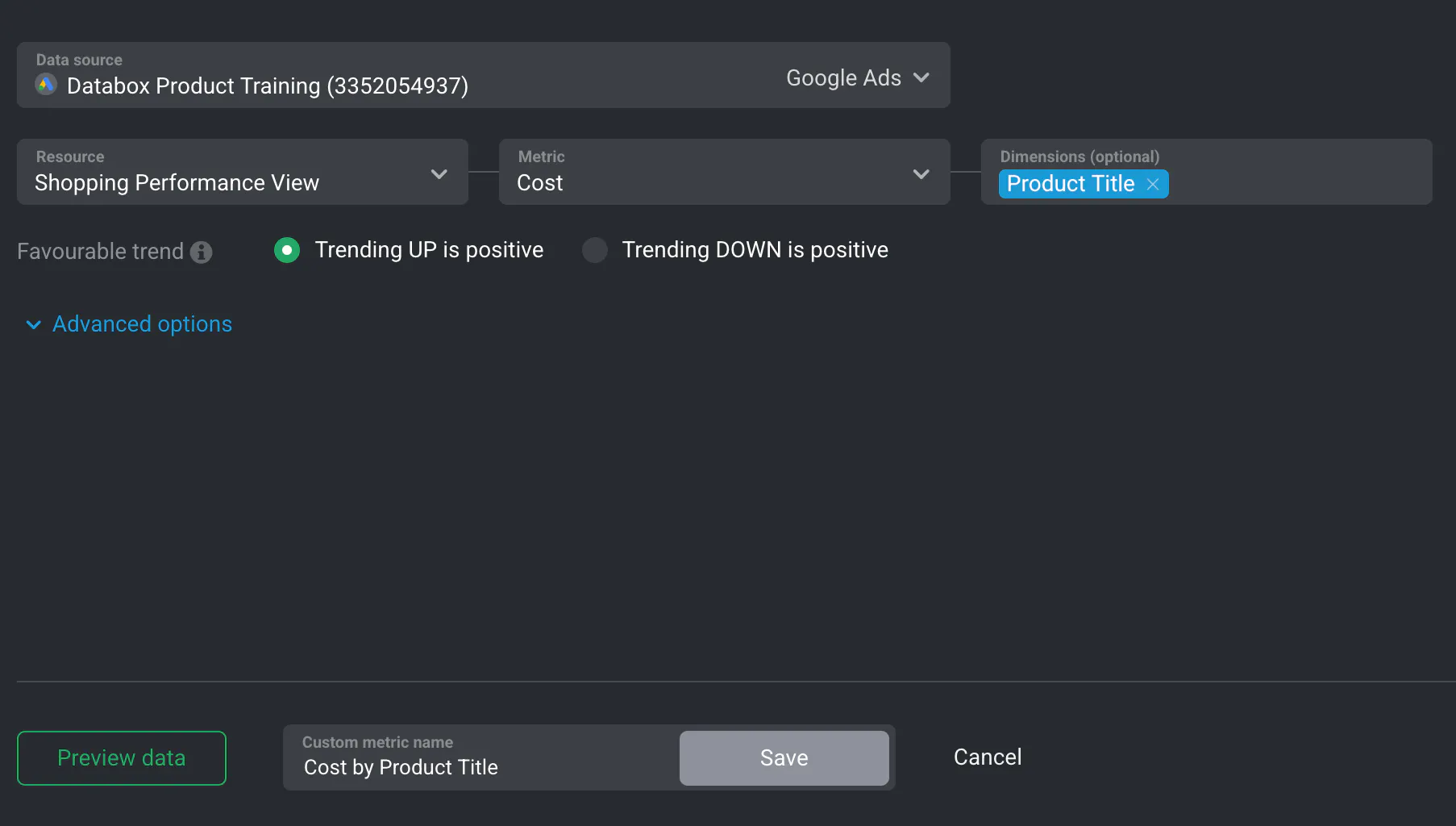 If you're running Google Ads campaigns across multiple products, it's useful to track how much you're spending on each product individually. You can easily report on this in Databox using Metric Builder and the appropriate Dimension.