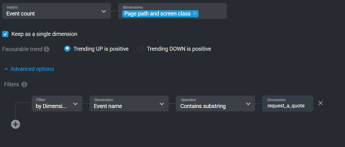 In the Filter section, choose Event name and enter the specific interaction you want to track (e.g., contact_form_submit, request_quote).